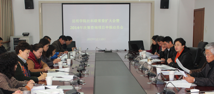 首先,熊晶副校长通报了《2014年度昆明市决策咨询课题选题征集通知》,并在分析昆明市经济社会发展急需研究、解决的问题基础上,向各院系指出申报领域,共同探讨申报思路。