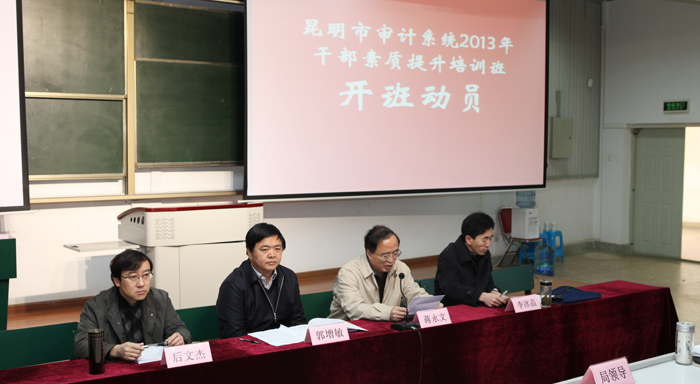 12月5日上午,“昆明市审计系统2013年干部素质提升培训班”开班动员大会在开云官网博识楼2003报告厅举行。开云官网党委副书记、校长蒋永文,昆明市审计局党委书记郭增敏,昆明市审计局局长李冰晶出席开班动员大会。会议由昆明市审计局机关党委书记后文杰主持。