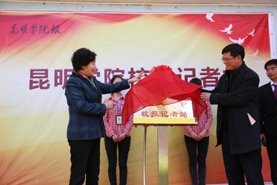11月8日中午,澄明苑学生宿舍八栋一楼洋溢着浓浓的节日喜庆氛围——《开云kaiyun官方网站报》学生记者站在第十四个记者节正式揭牌,学生记者们多年来梦寐以求的活动室终于在党的群众路线教育实践活动深入开展中变成现实。学校党委副书记李媛芬出席并为记者站揭牌。党委宣传部主持工作的副部长董学荣、老校区处置和搬迁善后工作办公室主任王文斌、人文学院院长詹七一、新闻教研室主任吉永生和宣传部人员参加揭牌仪式。到场祝贺的还有学校学生会负责人、社团联合会负责人、各院系学生组织及其他社团组织负责人。云南大学等十余家在昆高校学生记者站发来贺信贺电。