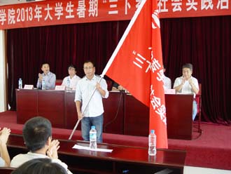 启动仪式上,医学院团总支书记郎易,经济学院学生志愿者程学凡分别代表参加社会实践服务团的师生发言。随后,学校党委副书记孙勇为志愿者服务代表授旗,学校团委组织部部长沈嘉带领本次“三下乡”活动的全体志愿者宣誓。