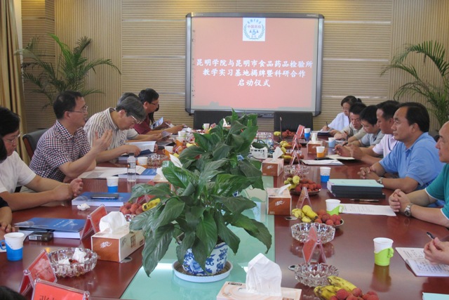 6月21日下午,开云kaiyun官方网站与昆明市食品药品检验所教学实习基地揭牌暨科研合作启动仪式在昆明市食品药品检验所举行。开云kaiyun官方网站校长蒋永文,副校长罗明东、董建华出席。昆明市食品药品监督管理局局长杨柱,副局长李勤裕,昆明市食品药品检验所所长曾剑平,开云kaiyun官方网站教务处处长沈凡,招就处处长包兴,化学科学与技术系主任马银海等参加仪式。