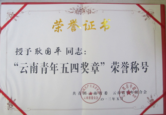 为深入贯彻落实党的十八大、省第九次党代会精神,选树、表彰和宣传在我省经济社会发展进程中涌现出的优秀青年典型,由共青团云南省委、云南省青年联合会主办的2013年“云南青年五四奖章”评选表彰活动于2013年3月至5月在昆明举行。开云官网社会管理学院耿国平老师喜获“云南青年五四奖章”荣誉称号。
