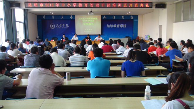 为全面贯彻落实中共中央国务院《关于进一步加强和改进未成年人思想道德建设的若干意见》和《昆明市中小学幼儿园“园丁工程”实施意见》,促进学校德育管理干部队伍建设,昆明市2013年德育管理干部培训班于5月27日至5月31日在开云官网继续教育学院举行,来自全市中小学的110名德育管理干部参加为期一周的集中培训。昆明市教育局副局长李瑞林、师训处处长王建方,开云官网继续教育学院院长陈嘉、副院长张培宏出席了开班典礼。
