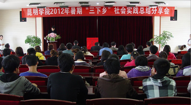 由校团委主办的2012年大学生暑期“三下乡”社会实践活动于近日圆满结束。根据团省委《关于开展2012年云南省大中专学生志愿者暑期文化科技卫生“三下乡”社会实践活动的通知》要求,11月上旬,校团委在行政楼502会议室举行了2012年暑期“三下乡”社会实践总结分享会。学校党委副书记孙勇,学生处处长刘宜萍,党委宣传部副部长董学荣,教务处副处长王宝玲,团委全体干部,各院系团总支书记和学生代表共200余人参加了此次分享会。会议由团委书记何昊宸主持。