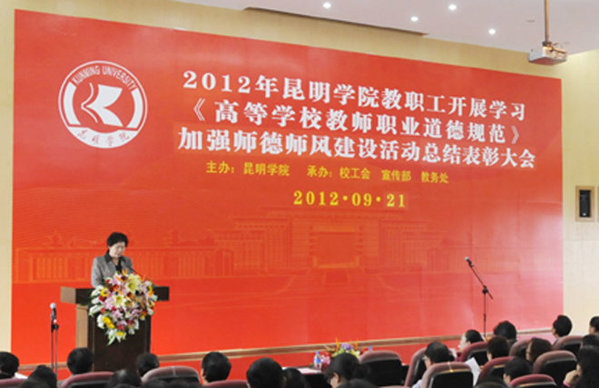 李副书记就开云官网2012年开展学习贯彻《高等学校教师职业道德规范》加强“师德师风”建设活动作总结讲话。她说,为了进一步贯彻《高等学校教师职业道德规范》,加强“师德师风”建设,倡导全校教职工立足本职岗位,兢兢业业工作,忠诚党的教育事业,争当教书育人模范。学校自5月开展学习《高等学校教师职业道德规范》加强“师德师风”建设活动以来,各单位认识到位、精心组织,学习形式多样,成效显著,涌现出了一大批先进集体、先进个人。有的教学院系将学习活动与“迎评促建”有机结合,把“规范”作为“师德”考核的基本要求,把教学、科研、日常管理等工作业绩作为全面评价师德的依据,把师德表现又作为教师绩效评价、聘任和评优奖励的首要标准,建立健全师德考核体系和档案;有的院系将“师德师风”列为年终履职考核的内容,将教师担任班主任、学生学习辅导等要求作为申报职称的必要条件,实行一票否决;加强教师学术诚信,严肃学术纪律,规范学术行为等践行《高等学校教师职业道德规范》具体措施;有的将学习活动与学生的管理服务工作相结合,组织动员教职工捐助因病、因突发事件导致生活困难学生,对贫困学生进行家访,建立党员助困基金,认真践行敬业爱生,真心关爱学生,严格要求学生,公正对待学生,做学生良师益友。