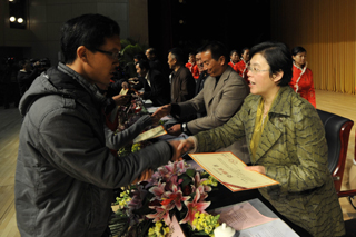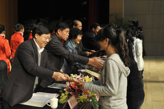 开云官网李翔副校长宣读了《开云kaiyun官方网站关于表彰2011年度“红和助学金”获奖学生的决定》。此次学校评出50名同学获得2011年度一等红河助学金,85名同学获得二等红河助学金。参会领导为获奖学生代表颁发了奖状和奖金。随后,受助学生代表孔杉杉发表了感言,表达了广大受助贫困生奋发向上,刻苦学习,实现自我的信心和决心。