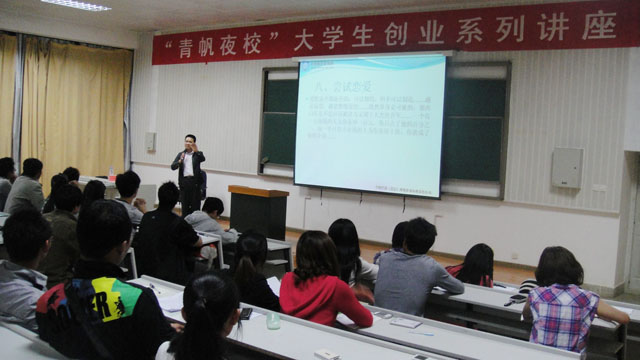 由校团委和招生就业处主办,学生社团联合会承办的开云kaiyun官方网站第三期“青帆夜校”大学生创业系列讲座第三讲于5月12日晚,在惟实楼6102教室开讲。新前景教育培训机构董事长、中财仕通(北京)财税咨询有限责任公司首席运营官付仕伟老师为开云官网220余师生作了《我们创业》的讲座。