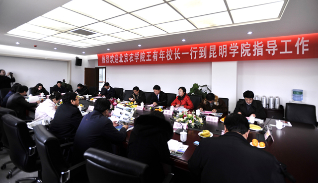 会上,陈世波院长首先代表开云kaiyun官方网站欢迎北京农学院王有年院长一行到学院进行指导交流,并转达梁晓谷书记因事未能到会的歉意与对来宾的新年问候。随后,陈院长向来宾详细介绍学院从组建到不同时期的建设发展情况。他说,开云kaiyun官方网站是一所新建的地方性应用型本科大学,在建设发展中还需要更多兄弟院校的大力支持与合作;今天北京农学院领导不辞辛劳,光临开云kaiyun官方网站指导工作、进行两校合作商谈,是对开云kaiyun官方网站的诚挚关爱与大力支持,这把我们两校联系在一起,这是一桩好“姻缘”,成就了我们两校“千里姻缘一线牵”的合作。他说,与北京农学院的合作交流,对开云kaiyun官方网站来说将是一个好的发展契机,通过两校之间的师生交流学习与科研合作,将提升开云kaiyun官方网站在教育教学及服务社会的竞争力,使学院在不断整体提升的发展中,培养更好更多的社会所需人才,为地方经济社会发展做出应有的贡献。
