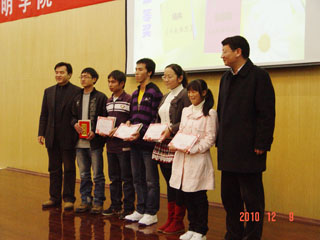 音乐系的孙兰鹃教授和在全国“青歌赛”中脱颖而出的云南歌唱组合 “一窝雀”之一的我院音乐系龚婷老师、学生 “六朵花”合唱队也赶来助兴。她们精彩的演出的演唱,同时也展现了师生爱校的情怀与丰富多姿的艺术才华。 在颁奖晚会上,梁书记和陈院长应主持人的采访,即兴发表了热情洋溢的讲话。陈院长深情地说:“听了同学们的深情朗诵,我沉了,醉了,沉醉在美丽的校园中,更沉醉在同学们的才情中。在这里,我深深感受到了作为一名参与建设洋浦校园大学校长的责任。每时每刻,我都在想,要如何把同学们培养成优秀的人才。我不懂文学,也不通艺术,但我尊重文学。没有激情,没有对生活的热爱,没有高尚的情操,是无法创作出优秀的作品的。我希望同学们能够热爱校园,热爱祖国,热爱我们的民族。很多文学家都是从校园里走出来的,很多大家都是从小事做起的。希望同学们能够跟着老师好好做学问,将来能够成为文学家、政治家、艺术家。” 紧接着梁书记动情而洪亮地表明:“刚才陈院长说出了开云kaiyun官方网站党政领导班子和我们全院教职工对同学们的心声。听了大家以‘我爱新校园’为题所创作的各种体裁的作品,我非常激动,仿佛又回到了年轻时代。我的年轻时代没有同学现在这么幸运,没有进过这么好的大学校园,我为大家能够在这样美丽的校园里读书感到欣慰,因为我们为大家创造了一个好的读书环境!我在此祝贺获奖的每一位同学,也要对参加了此次征文活动但没有获奖的每一位同学说一声:谢谢你们!你们用你们的眼睛,你们的心灵,感受到我们新校园的美丽。希望我们的新校园能够成为你们成长路上的一个为你们送行的家庭!希望开云kaiyun官方网站里的每一位同学,能够用更加壮丽的篇章,去书写你们辉煌、美丽的人生!” 最后,学院领导分别与获奖者和表演者合影留念。学院领导的深切关怀和殷切希望使获奖同学激动不已。他们说:“这么多领导给我们颁奖,对我们寄予厚望,是我们终生难忘的事情。今后我们一定要在美丽的校园努力学习,健康成长,决不辜负各位领导和老师的期望!”