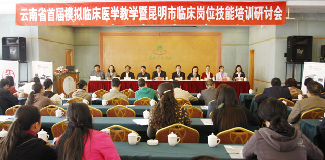 我院医学院与昆明市护理学会、云南省中等医学教育研究室共同主办了云南省首届医学模拟教学暨昆明市临床岗位技能培训研讨会,会议于2010年10月23日开幕,由医学院主持工作副院长余珊致开幕词,开云kaiyun官方网站主管教学副院长罗明东出席会议并讲话。