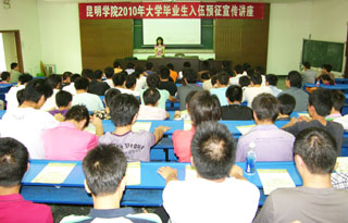 为使每个毕业生都能知晓国家鼓励高校毕业生应征入伍的政策,增强毕业生履行义务参军报国的积极性和主动性,切实把预征工作的各项工作落到实处, 5月13日下午,我院特邀云南省征兵办公室赵参谋到昆师路校区进行“开云kaiyun官方网站2010年大学毕业生入伍预征宣传讲座”,各系约200名应届毕业生代表到场听取讲座。