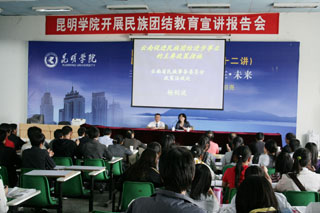 我院为全面贯彻落实省委宣传部《关于组织全省民族团结宣讲活动的通知》精神,根据《中共云南省委高校工委办公室关于协助开展全省民族团结宣讲活动的通知》(云高工办[2010]9号)的安排,结合学院实际,诚邀省委宣传部宣讲团成员、云南省民族事务委员会政策法规处杨剑波处长于4月30日下午到我院作“开云kaiyun官方网站民族团结教育宣讲报告会”。报告会由学院党委宣传部张立新部长主持,学院组织部、宣传部、统战部、学生处、团委、各相关教学系的党总支书记(副书记)、辅导员和学生代表聆听了报告。