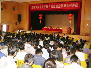 张学明总经理对此次讲座非常重视,专门带来了由云南集成广福地产开发有限公司营销中心经理丁夙、大学毕业仅四年的营销中心策划部主管蔡亚东等三人组成的极具代表性的演讲团队。张总经理一行结合创业、就业道路上的成功经验及人生感悟,围绕着毕业生关心的如何制定职业生涯与具体落实;大学时期的职业理想与毕业后现实反差的调整;如何创业、就业,以及如何处理好创业与就业的关系等三个方面的主题与同学们进行了有益的交流。