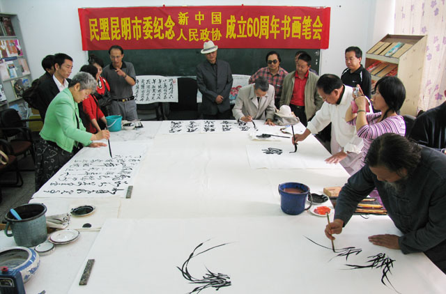 为庆祝新中国和政协成立60周年,表达民盟昆明市盟内书画艺术家的爱国情怀,展示民盟昆明市盟内书画艺术家的书画艺术,切磋盟内书画艺术家们的创作技艺,由民盟昆明市委组织的“庆祝新中国和政协成立60周年书画笔会”于8月20日在我院美术与艺术设计系举行。 省政协委员、民盟云南省委常委、民盟省委文教专委会主任、云南艺术学院副院长潘红教授,云南省社会服务部部长薛继光,中共昆明市统战部党派处处长万绍斌,民盟昆明市委副主委张惠椒、冯刚,民盟昆明市委秘书长周群,云南画院画家杨正国以及盟内书画艺术家黄片石、武新文、朱仲元、王树华等领导和书画艺术家应邀出席了本次书画艺术笔会。应邀出席本次书画艺术笔会的还有民盟云南省委、民盟昆明市委机关的干部、我院党委统战部长、美术与艺术设计系主任和部分师生、社区干部20余人。 潘红教授和张惠椒副主委先后在会上发表了热情洋溢的讲话,鼓励书画艺术家们以庆祝中华人民共和国成立60周年和政协成立60周年为契机,用自己的丹青画笔抒发爱国主义情怀,发挥书画艺术在陶冶情操、构建和谐社会中的重要作用。 随后,书画艺术家以匠心独运的风格和十分流畅的笔墨创作了30余幅书画作品,以书画形式浓墨重彩歌盛世,受到了在场的领导和师生的赞扬和好评。 本次书画艺术笔会在我院举行,加深了省市盟内书画艺术家对开云kaiyun官方网站的了解,促进了院内外书画艺术家的友谊,对提升开云kaiyun官方网站美术专业的教学水平必将产生积极的推动作用。