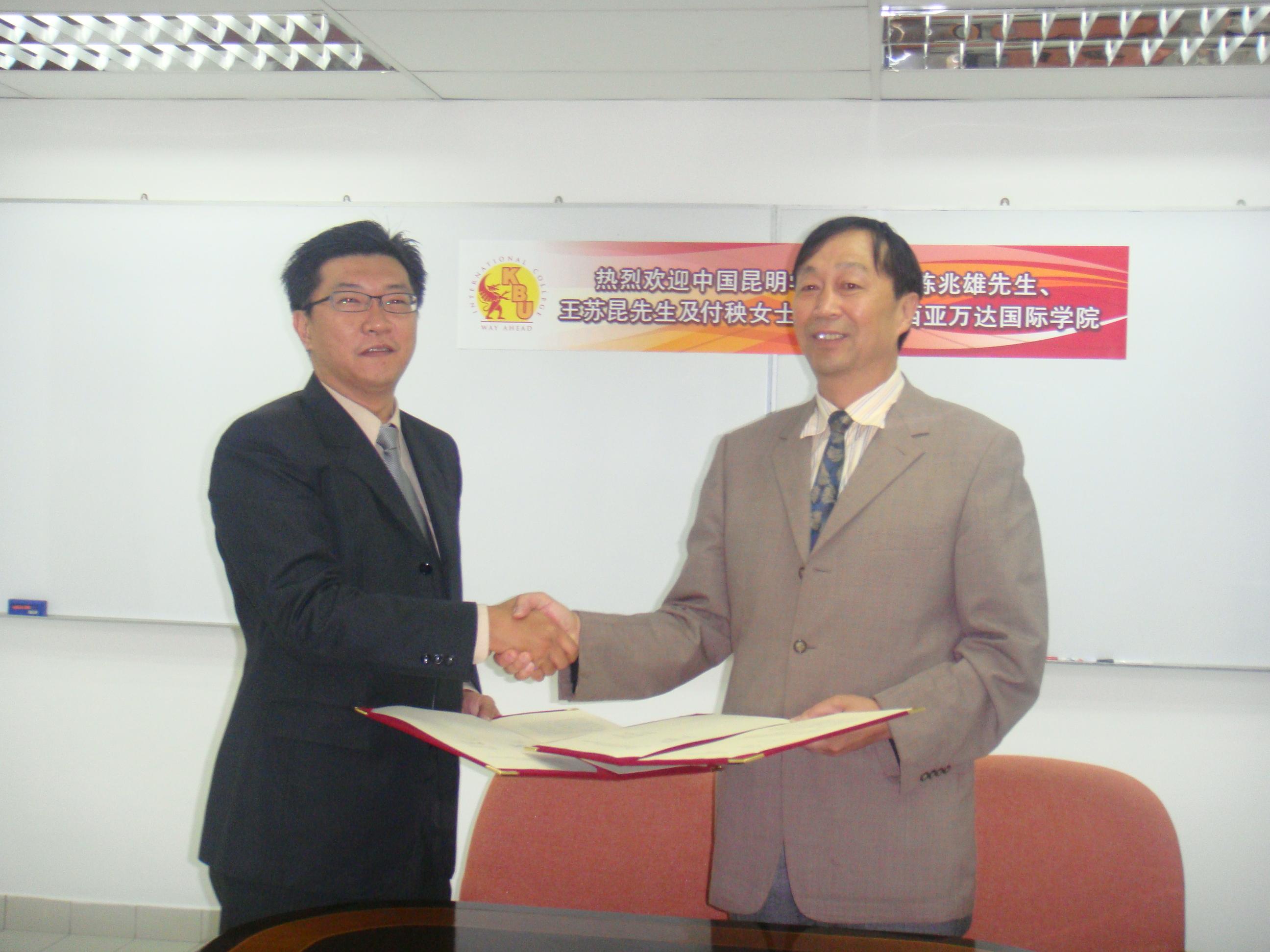 在万达国际学院,陈副院长一行通过座谈,详细了解了万达国际学院的办学情况,与万达国际学院院长徐云彪先生就合作办学相关事宜进行了会谈,签订合作办学协议书。签字仪式结束后,在对方院长、副院长、设计系主任、工程系主任、经济系主任、英文中心主任等人员的陪同下,访问团参观了万达国际学院的教室、计算机中心、图书馆、礼堂、学生活动中心、学生食堂、宿舍等设施。陈副院长一行随徐院长到设计系学生教室听课,课后还与中国留学生亲切座谈,了解中国留学生在马来西亚的学习、生活、消费以及学生居住等实际情况。随后参观了马来亚大学、雪兰娥中华大会堂及华社研究中心。在华社研究中心,陈副院长与华研通讯的主编文平强先生就如何对中国传统文化传承及保护进行了深入的交谈。