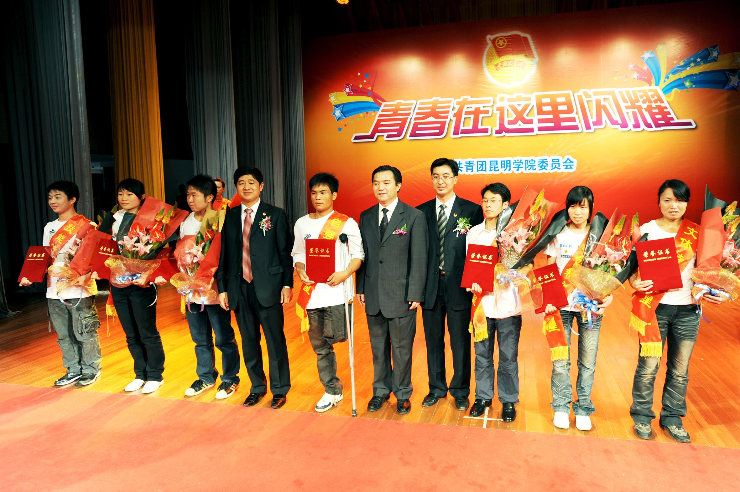典礼特别邀请到团省委副书记陆平、团市委罗永斌书记,省学联主席、以及云南大学,师范大学等十二所在昆兄弟院校代表、市卫校、市农校领导出席。我院党委梁晓谷书记、孙勇副书记、陈兆雄副院长、熊晶副院长、学院全体中层干部、各系团总支书记、全体辅导员、班主任代表及学生团员代表共800余人参加了本次颁奖典礼。