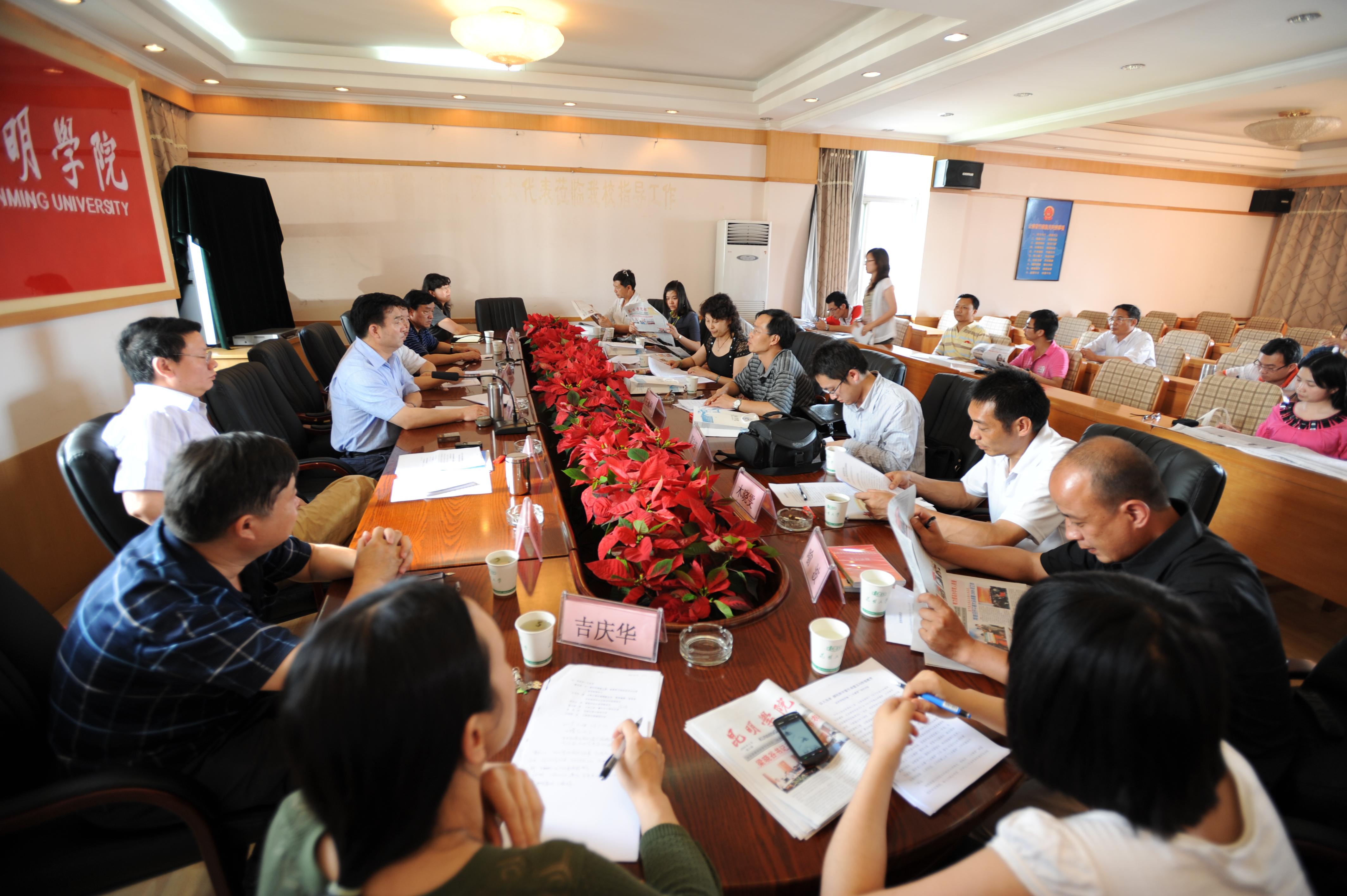 在靳昆萍副组长简单介绍了采访团来意后,我院党委梁晓谷书记以《确立科学办学观,立足昆明,为地方经济社会发展服务》为主题,介绍了我院学习实践科学发展观活动的特色亮点。梁书记着重介绍了我院从新近合并、升本的实际入手,以为地方经济发展服务的高校职能和办人民满意的学校的办学宗旨为出发点,加大实践力度,创新思维,利用昆明科学发展研究院和滇池(湖泊)污染防治研究合作中心两个科研平台,成功举办“首届昆明科学发展高层论坛”,影响很大,积极与国内外相关机构开展滇池治污研究合作;立足昆明,走出去到县、区进行调研,结合新昆明建设开展研究,在服务地方经济的同时,提升学院科研水平的典型事例。