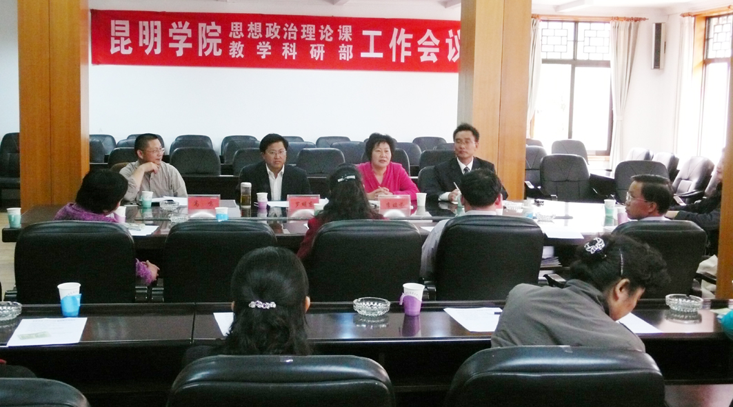 开云kaiyun官方网站为了加强思想政治理论课,由社会科学与人力资源系原“两课”教学人员和原昆明师专“两课”教研室组建成立了开云kaiyun官方网站思想政治理论课教学科研部,共32位教师。经过系部整合后的思想政治理论课教学科研部,为进一步推进工作,于10月30日下午,召开了全体教师工作会。学院思想政治理论课建设领导小组组长李媛芬副书记、副组长罗明东副院长、宣传部负责人出席了会议。
