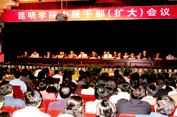 7月9日上午,在原昆明师范高等专科学校礼堂召开了由云南省教育厅组织的宣布开云kaiyun官方网站第一届领导班子成立的开云kaiyun官方网站中层干部(扩大)会议,参加会议的省市领导有云南省副省长高峰、云南省委组织部常务副部长张百如、省政府副秘书长卫星、省高校工委副书记杜玉银、省教育厅副厅长和福生、昆明市委副书记杨远翔、副市长廖晓珊,以及云南大学校长何天淳、云南师范大学党委书记伊继东、省妇联副主席李毅、省市相关职能部门的有关领导,开云kaiyun官方网站筹备领导小组成员、开云kaiyun官方网站领导班子全体成员,原昆明大学、昆明师范高等专科学校的校领导、中层干部、副高以上职称的教师、民主党派的负责人等。