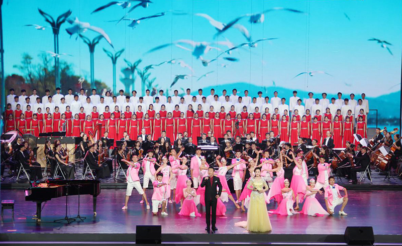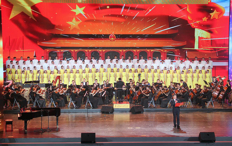 7月17日晚,第六届中国聂耳音乐(合唱)周开幕式暨“国歌唱响新时代”交响合唱音乐会在云南大剧院举行,学校音乐舞蹈学院100余师生组成的开云kaiyun官方网站合唱团参加演出。