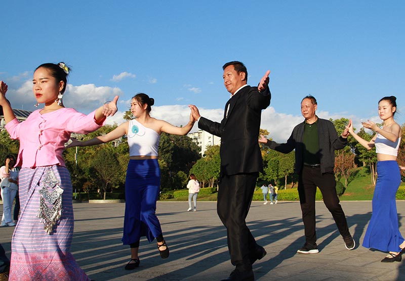 闭营仪式后,全体参会人员到学校聂耳广场共同参与傣族传统节目打跳,感受民族特色风情。