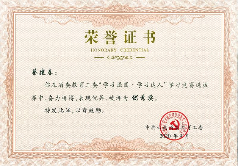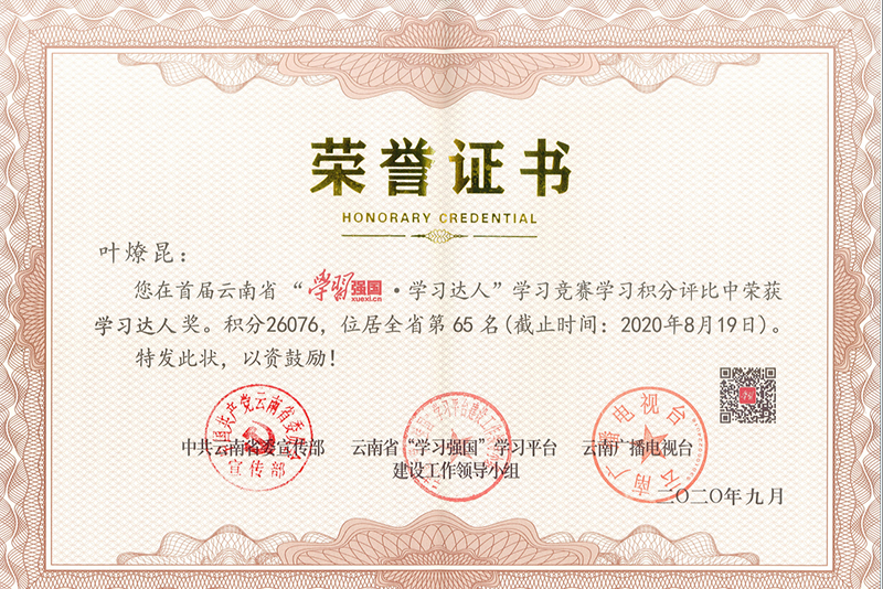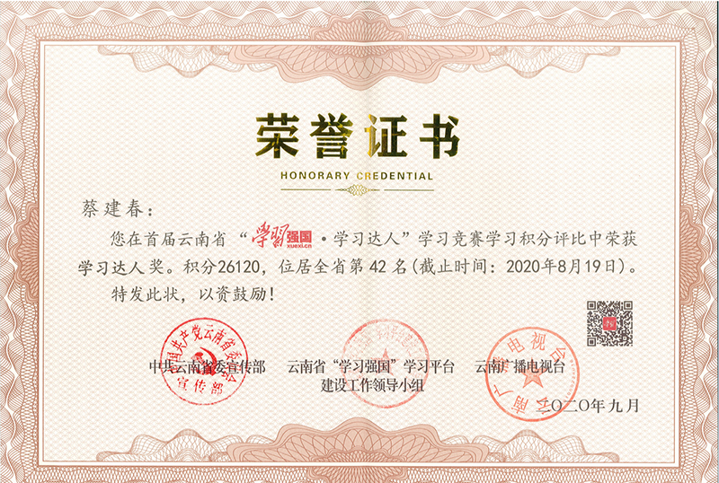 近日,首届云南省“学习强国·学习达人”学习竞赛在昆明成功举行。学校选送参赛的教师在比赛中取得喜人成绩,蔡建春、叶燎昆两位老师在个人学习强国积分评比中,进入全省100强,获“学习达人”称号;蔡建春老师在省委教育工委“学习强国·学习达人”学习竞赛选拔赛中,表现优异,被评为“优秀奖”。