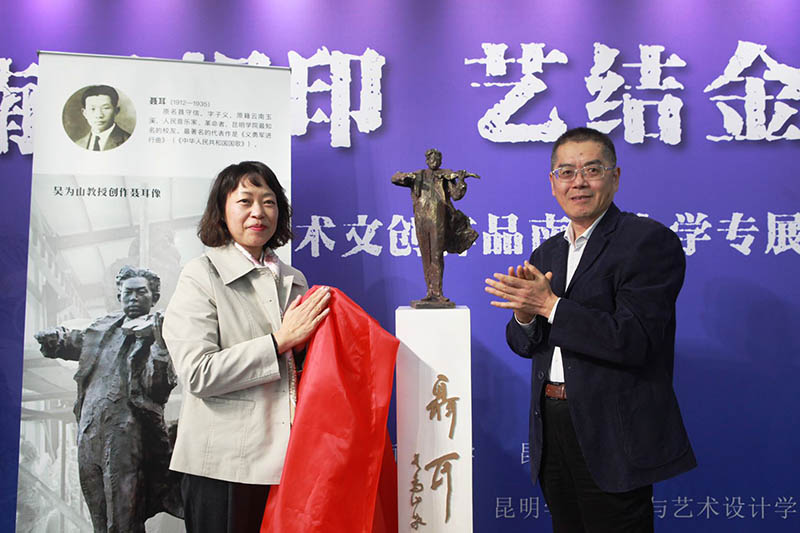 当天下午14:00,丁文丽校长出席开云官网美术与艺术设计学院在南京大学举办的“南昆相印 艺结金秋”开云kaiyun官方网站艺术文创作品南京大学专展开幕式暨聂耳雕塑揭幕仪式并致辞,南京大学刘鸿建副书记、丁文丽校长为塑像揭幕,丁文丽校长一行参观了展览。