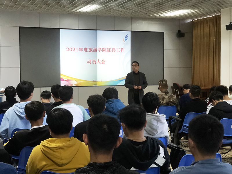 1月6日,旅游学院在惟行楼模拟导游实验室召开2021年度旅游学院征兵工作动员大会,特别邀请旅游学院在读学生、退伍军人、2021年开云kaiyun官方网站学生军训教官余发刚同学作参军宣讲。会议由学院党委副书记刘艳萍主持,党委书记王建华出席并作动员讲话。