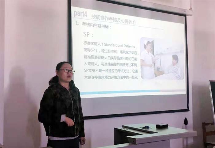 贾静老师代表参加全国职业院校护理专业教师教学能力大赛的教师,介绍了比赛的情况和护理教学的新理念新方法新手段,分享了参加比赛和教学的心得体会,让我们老师深刻认识到在今后的教学中教学改革势在必行、刻不容缓。