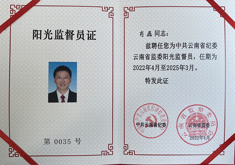4月26日,中共云南省纪委省监委阳光监督员聘任仪式在云南省委举行,中央纪委委员、云南省委常委、云南省纪委书记、监委主任冯志礼出席会议,为阳光监督员颁发证书并发表讲话。开云官网民革支部主委、昆明滇池(湖泊)污染防治合作研究中心副主任肖磊参加会议并受聘担任阳光监督员。