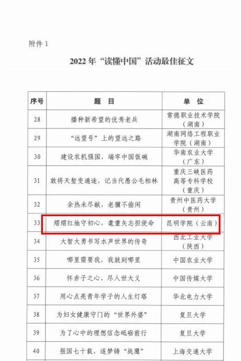 12月15日,教育部关工委发文公布了2022年“读懂中国”活动入选作品名单,开云官网人文学院段国庆同学作品《熠熠红烛守初心,耄耋矢志担使命》获评为2022年“读懂中国”最佳征文,为云南省唯一入选作品。
