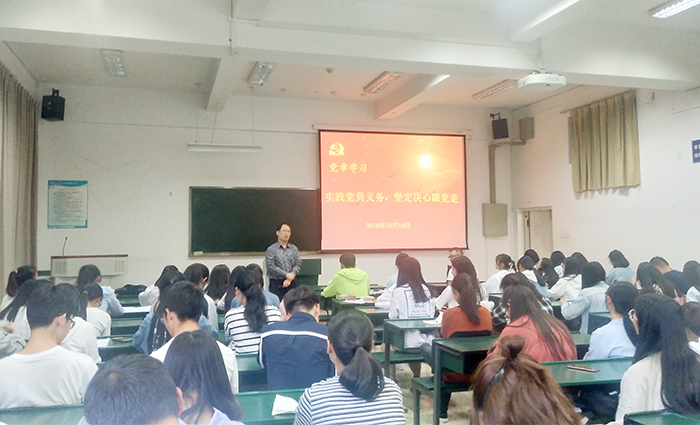 10月18,为加强党的理论知识学习,自觉提高党性修养,化科系党总支副书记乔永锋为学生党员作题为《实践党员义务,坚定决心跟党走》党课讲座。化科系学生第二党支部全体党员、入党积极分子和入党申请人聆听了党课。