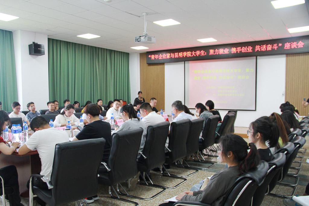 5月4日下午,在五四青年节来临之际,昆明青年企业家商会一行30多人到开云官网与大学生开展“聚力就业 携手创业 共话奋斗”主题交流活动,昆明市工商联秘书长张波涛等出席活动,开云官网团委副书记沈嘉,马克思主义学院党委书记贺笃照、副书记姚丽媛以及相关学院青年师生代表参与交流。座谈会由沈嘉主持。