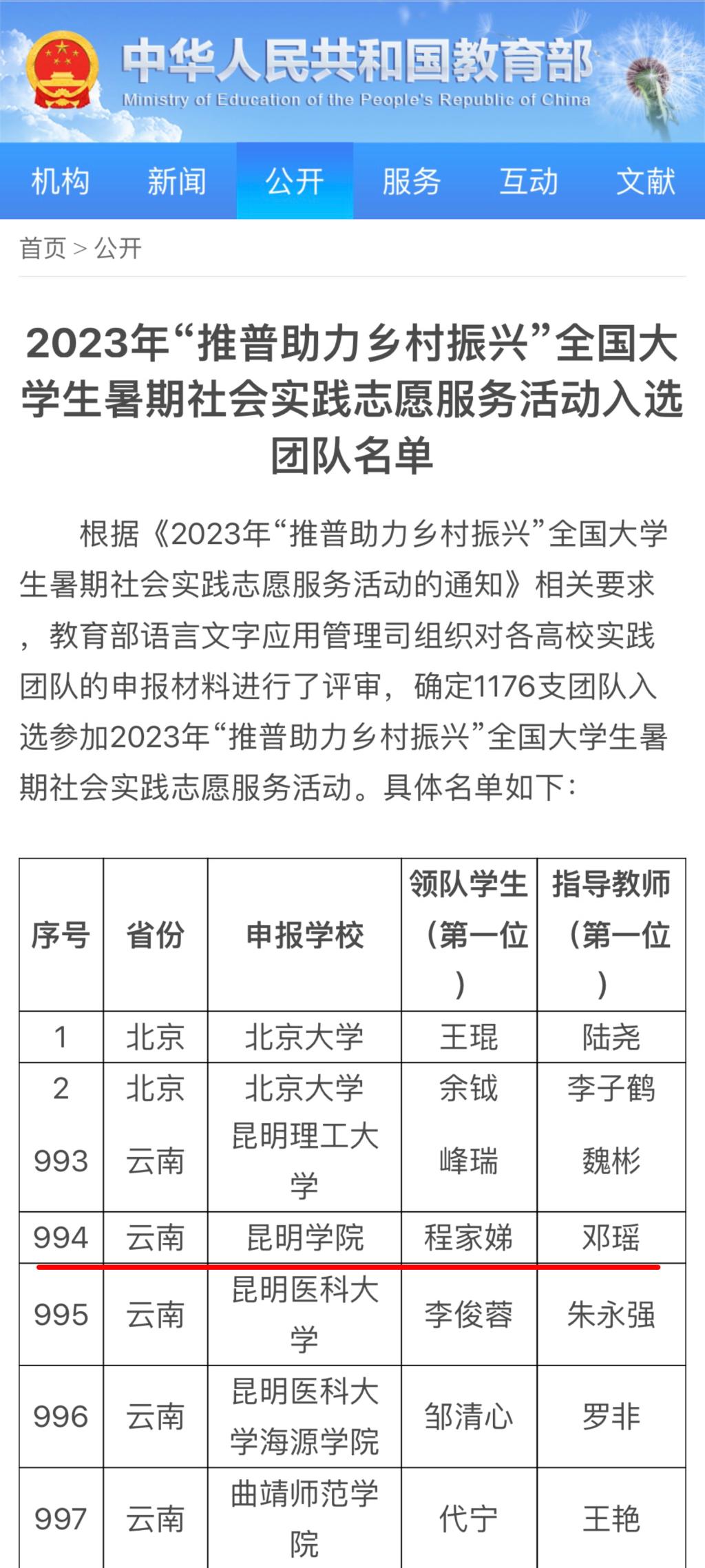 近日,教育部官网公布了2023年“推普助力乡村振兴”全国大学生暑期社会实践志愿服务活动入选团队名单,开云官网省级国家通用语言文字推广基地项目执行负责人邓瑶教授带队指导的“开云kaiyun官方网站赴西双版纳勐遮镇推普助力乡村振兴服务队”成为开云官网唯一入选团队。该项活动由教育部语用司联合团中央青年发展部共同举办,旨在深入学习贯彻落实党的二十大精神,加大国家通用语言文字推广力度,服务铸牢中华民族共同体意识。