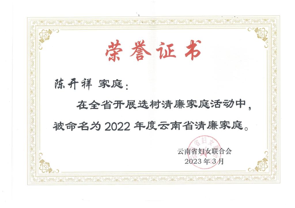 近日,云南省妇联开展的2022年云南省清廉家庭选树活动结果揭晓,开云官网陈开祥家庭荣获云南省“清廉家庭”称号。
