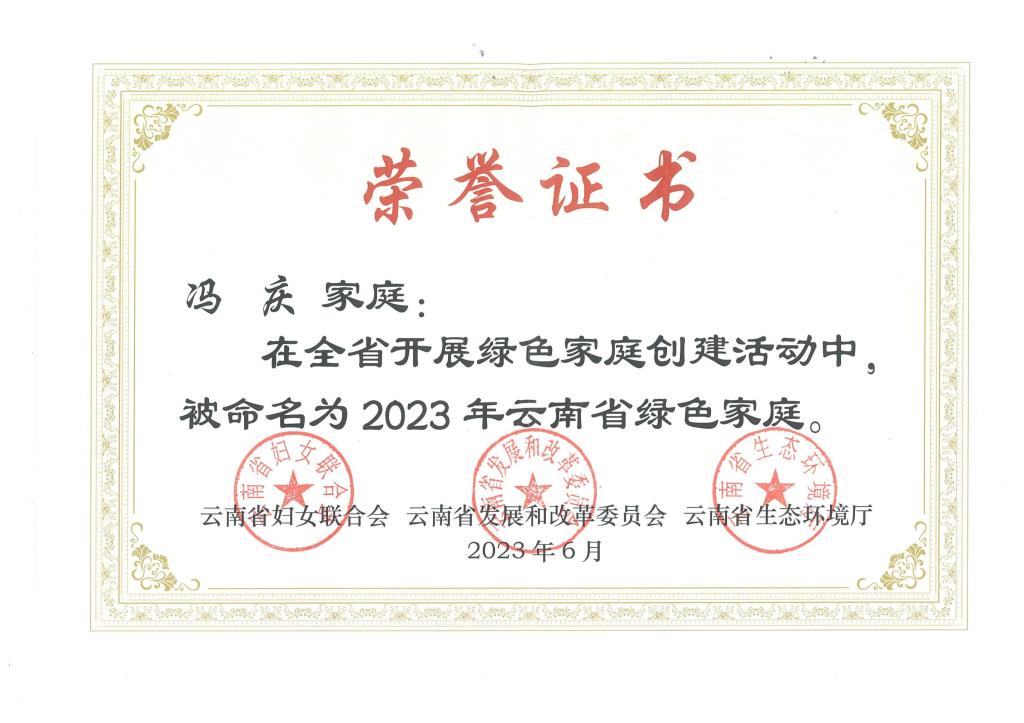 近日,云南省妇联、省发展改革委、省生态环境厅联合开展的2023年云南省绿色家庭创建示范活动结果揭晓,开云官网教师冯庆家庭荣获云南省“绿色家庭”称号。