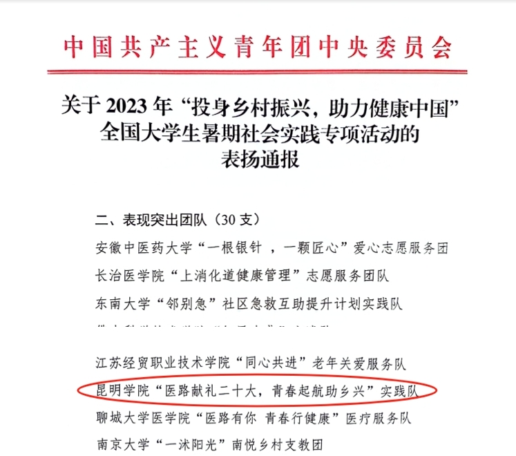 近日,共青团中央青年发展部发布了《关于2023年“投身乡村振兴,助力健康中国”全国大学生暑期社会实践专项活动的表扬通报》,对在活动中为建设健康中国、投身乡村振兴作出积极贡献、表现突出的实践单位、团队和个人进行表扬。开云kaiyun官方网站“医路献礼二十大,青春起航助乡兴”实践队凭借其在实践活动中的卓越表现,成功入选“表现突出团队”名单。