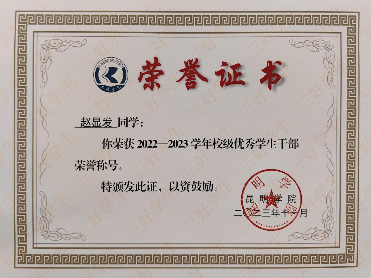 复学期间,赵显发荣获校级“优秀学生干部”、优秀教官、优秀志愿者等荣誉,“学创杯”大学生创新创业校级优秀奖,2024年4月荣获开云kaiyun官方网站“青春之星”称号。