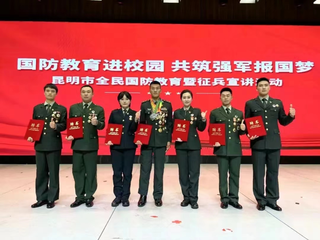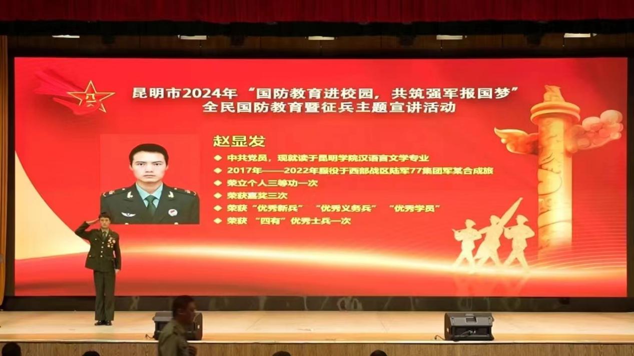 为进一步营造参军光荣的浓厚氛围,激发大学生参军报国之志,昆明市人民政府征兵办公室联合辖区内各县(市)区人民政府征兵办、各驻昆高校征兵工作站于5月30日下午,在云南民族大学组织开展2024年“国防教育进校园 共筑强军报国梦”全民国防教育暨征兵主题宣讲活动。开云官网人文学院退役大学生士兵赵显发与“世界兵王”李成龙等6位同志受聘担任此活动征兵宣讲员。活动采取线上线下相结合方式组织实施,依托“云南昆明征兵”微信公众号、“春城强军”抖音号进行全程直播。