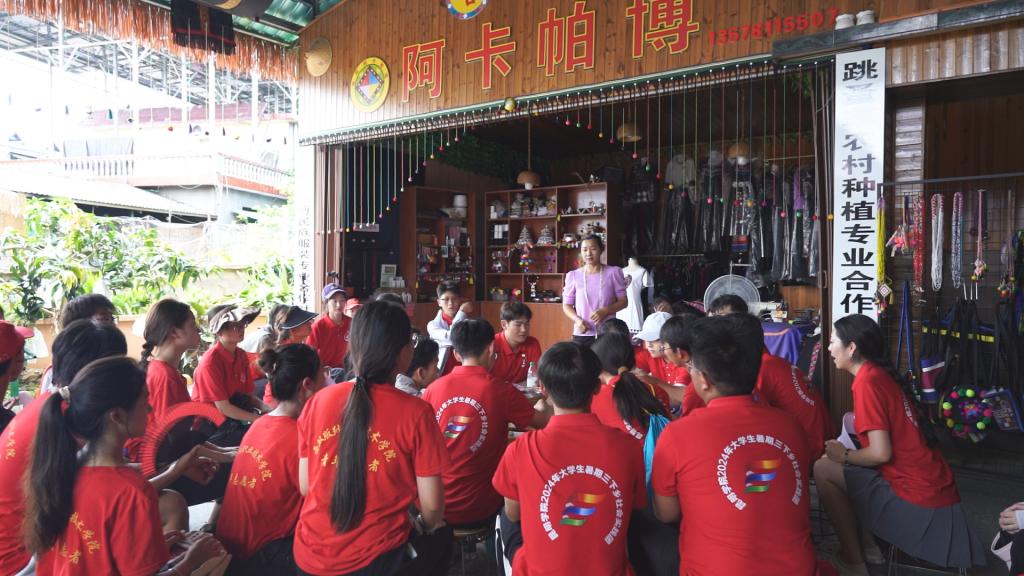在勐仑镇哈尼族大卡老寨,师生们跟随工作人员脚步走进寨子,深入了解近年来老寨的新面貌、新变化、新风采。阿卡帕博民族服装合作社社长刘智芳向师生介绍了美丽独特的哈尼族服饰,以及将民族刺绣结合跳蚤草的功效缝制而成的跳蚤草香包。实践团还围绕大卡老寨民宿、餐厅、鸟塘、跳蚤草、热带水果种植等特色产业发展与民族文化传承发展的情况与村民进行交流访谈,近年来,大卡老寨坚持党建引领,激活红色引擎,因地制宜,建设农业强、农村美、农民富的美好家园,同学们纷纷表示通过本次实践交流,对铸牢中华民族共同体意识,促进各民族共同繁荣有了更为深刻的认识,作为云岭学子,必须结合实际拓展创新,为推进民族团结进步事业,推进新时代党的民族工作高质量发展贡献自己的力量。