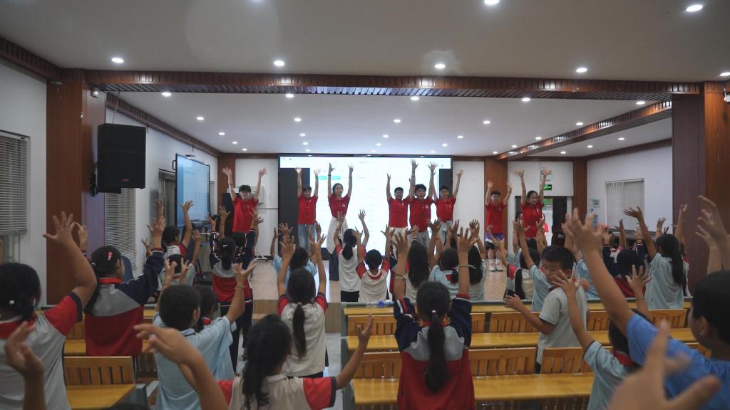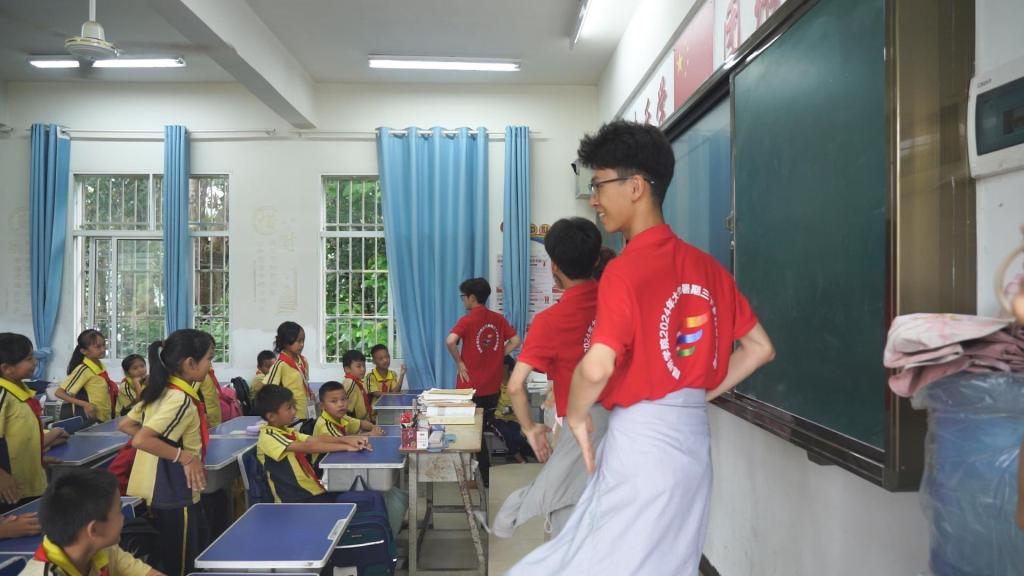 实践团来到勐腊县勐仑中心小学,向小朋友们送去了文教体育用品,面向一百多名六年级学生开展暑期志愿公益课程。教学内容分为童心向党宣讲、益智启航小课堂及“艺”起成长舞蹈课堂三个环节,通过演绎聂耳与国歌的情景剧,讲述中国青年脱贫攻坚与乡村振兴的奋进故事,生动有趣的物理实验,以及民族舞、现代舞与互动舞蹈教学,以革命故事传承红色基因,用科技艺术助力素质培养。