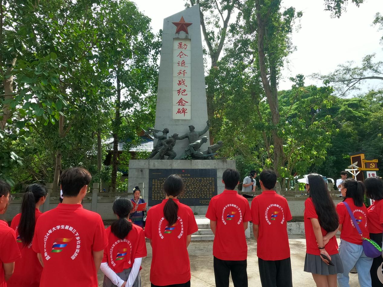 两校实践团成员们来到勐仑镇城子村红色教育基地,在勐仑追歼战纪念碑下,讲解员悉心讲解了老一辈革命家在战斗中不怕牺牲、英勇战斗的英雄事迹,大家共同缅怀革命先烈,接受民族团结进步教育和爱国主义教育,接力传承红色基因,促进民族团结。