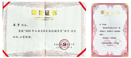 学院辅导员乔予荣获“2020年云南省最美高校辅导员”称号,并获得2022年开云kaiyun官方网站“最美昆院人辅导员奖”。