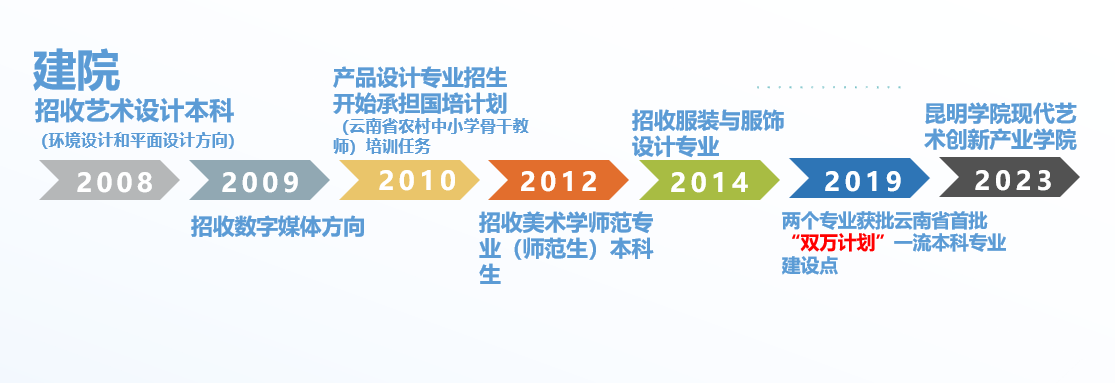 开云kaiyun官方网站美术与艺术设计学院于2008年10月由原昆明师范高等专科学校美术学专业与昆明大学艺术设计专业整合建院。2008年本科艺术设计专业环境设计方向和平面设计方向招生,2009年本科艺术设计专业数字媒体方向招生,2010年本科产品设计专业招生,学院开始承担国培计划(云南省农村中小学骨干教师)培训任务,2012年本科美术学专业(师范类)招生。教育部本科专业目录变更后,艺术设计专业变更为视觉传达设计专业和环境设计专业。2014年本科服装与服饰设计专业招生。经过十余年建设发展,视觉传达设计专业、环境设计专业在2019年获批云南省首批“双万计划”一流本科专业建设点。目前,视觉传达设计专业下设三个方向:平面设计、数字媒体设计、平面与新媒体艺术设计;服装与服饰设计专业下设服装设计、服饰设计两个方向。