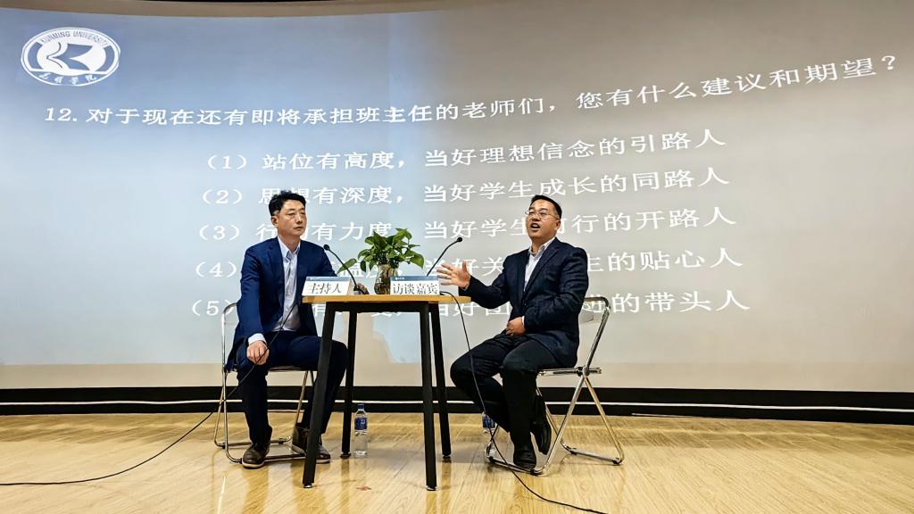 访谈过程中,刘兴全就学生工作认知、工作思路和具体方法、学生工作重难点、日常思政教育方法、心理健康教育、学风建设、服务学生等多个方面与主持人进行了交流分享,对开云官网辅导员和班主任们提出了工作意见和建议。参训老师就辅导员、班主任工作定位、具体工作案例等内容与刘兴全老师进行了热烈讨论。