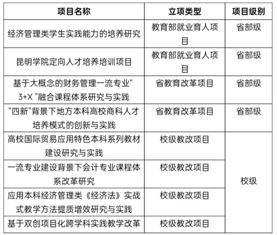学院现有国际经济与贸易、财务管理、工商管理、会计学四个本科专业。2019年财务管理专业被列为云南省首批一流本科建设专业,国际经济与贸易专业被列为云南省本科教学特色专业以及云南省专业群改革建设试点专业。自2019年起承担开云kaiyun官方网站创新人才(理科)基地班的人才培养工作,2020年,以四个本科专业为基础申请获批国际商务专业硕士学位点,并于2021年开始招生。2022年在国际经济与贸易专业分设自贸学院本科教学班——自贸班。截至2024年5月学院共有在校生1432人,其中研究生64人,留学生70余名,形成了“本-硕”和留学生教育多层次的人才培养体系。