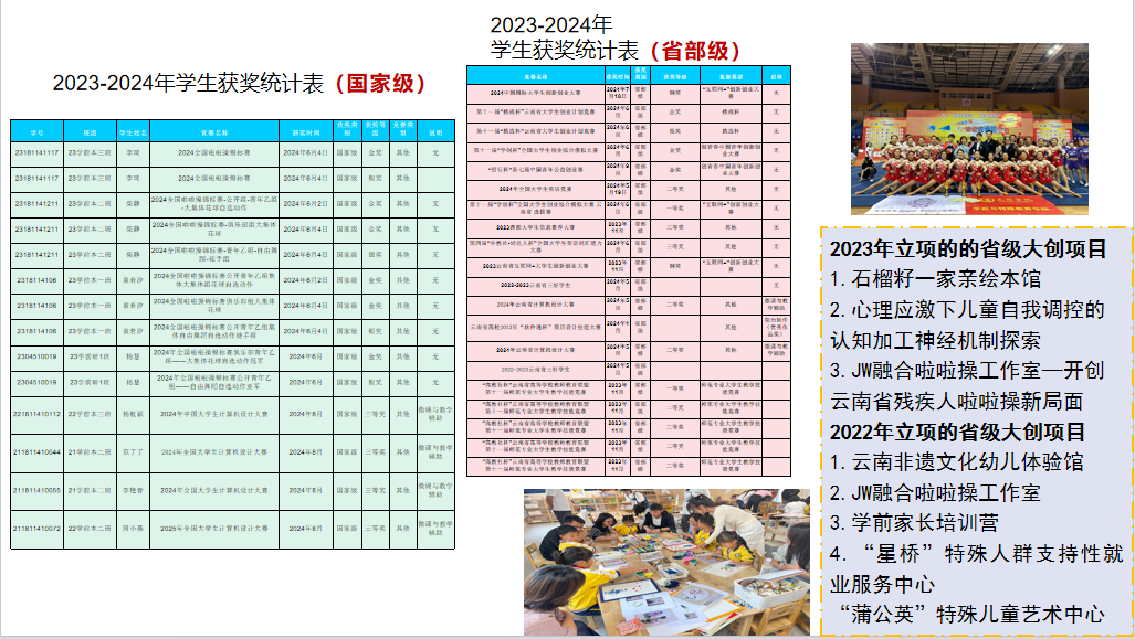 学院在课程建设、教材建设和教学研究方面取得了一系列成果,包括教学成果奖、省级一流本科课程、教学竞赛获奖、教改项目立项以及创新团队设立等。其中:学前教育专业与特殊教育专业共同完成的“政-校-园协同:特殊需要幼儿高质量学前融合教育模式构建与实施”获云南省教学成果奖(基础教育)一等奖,《幼儿园管理》立项省级一流本科课程,《学前教育原理》立项省级课程思政示范课程,《学前儿童心理学》获省赛二等奖,《“新师范”背景下“嵌入式” 课程思政模式创新及实践》获省级教改项目立项;世行项目案例2项入选全球减贫案例;《“校-园”协同,特殊幼儿学前融合教育实践与探索——开云kaiyun官方网站附属幼儿园融合教育案例》入选首届全国特殊教育融合教育优秀教育教学案例;出版学前融合教育系列教材4本。