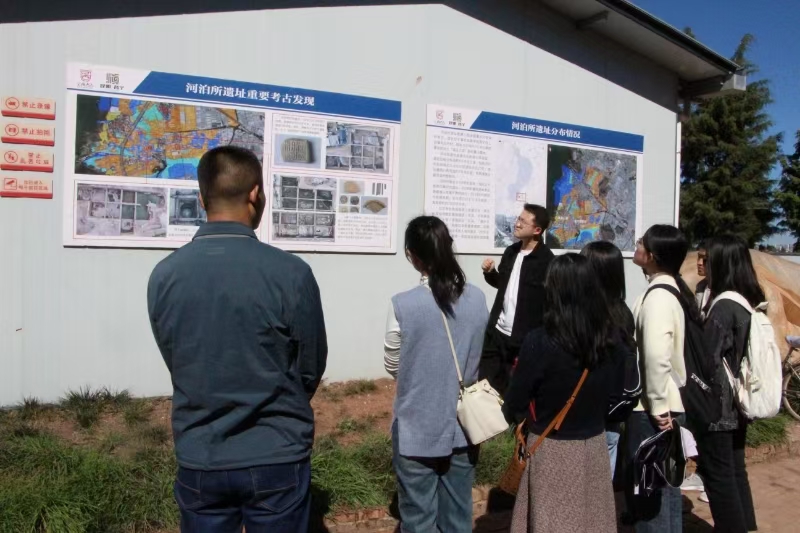 最后,团队前往晋宁古城村遗址,这里是云南已知保存较完整的一处大型湖滨贝丘遗址。听取了唐辰昊老师关于保存完整的环壕聚落结构、半地穴式房址以及二次葬土坑墓等早期人类生活遗迹和文化现象的介绍。