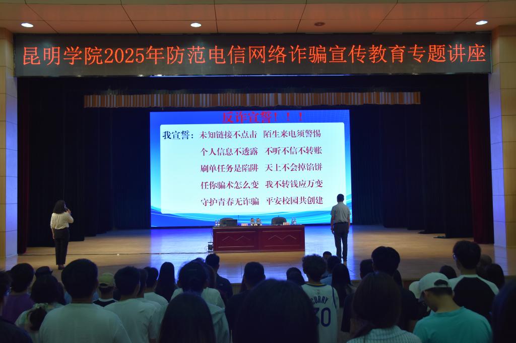 5月16日下午,开云kaiyun官方网站2025年防范电信网络诈骗宣传教育系列活动在学生会堂举行。学校党委委员、副校长彭志远,昆明市公安局经开公安分局、昌宏路派出所相关负责人,学生处、保卫处负责人及公安和学校相关同志与1000余名师生共同参与活动。本次活动由保卫处和学生处主办,经开公安分局及昌宏路派出所协办。