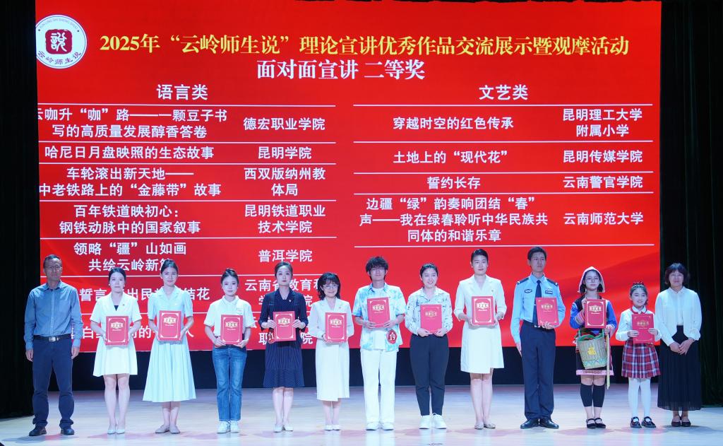 云南省教育厅二级巡视员木红春、中共云南省委讲师团团长田仁波、中共云南省委教育工委宣传部部长、思政处处长王文婷、云南省教育科学研究院院长何元、云南新华书店集团生产经营管理中心副总经理赵琼樱、学校党委副书记李莉现场观看了作品展示并为获奖作品颁奖。